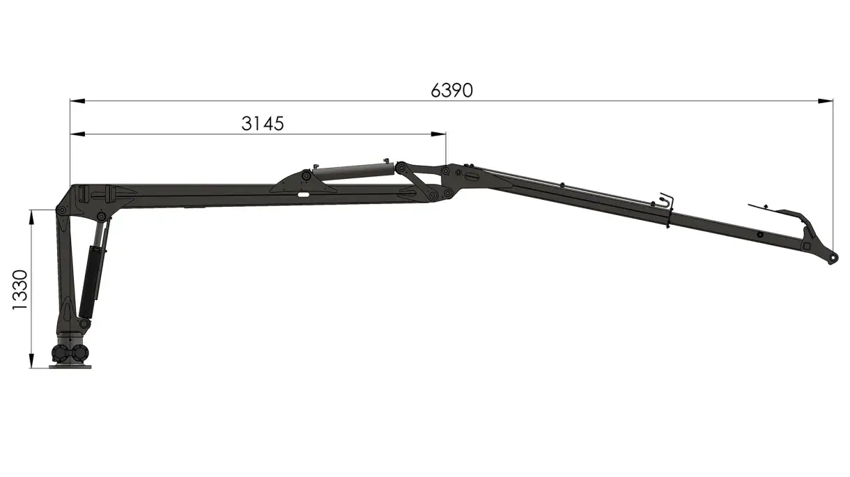This crane has a reach of 6.3 m and an extension of 1.1 m. The crane lifts 500 kg at full reach, excluding the grapple, rotator and link.