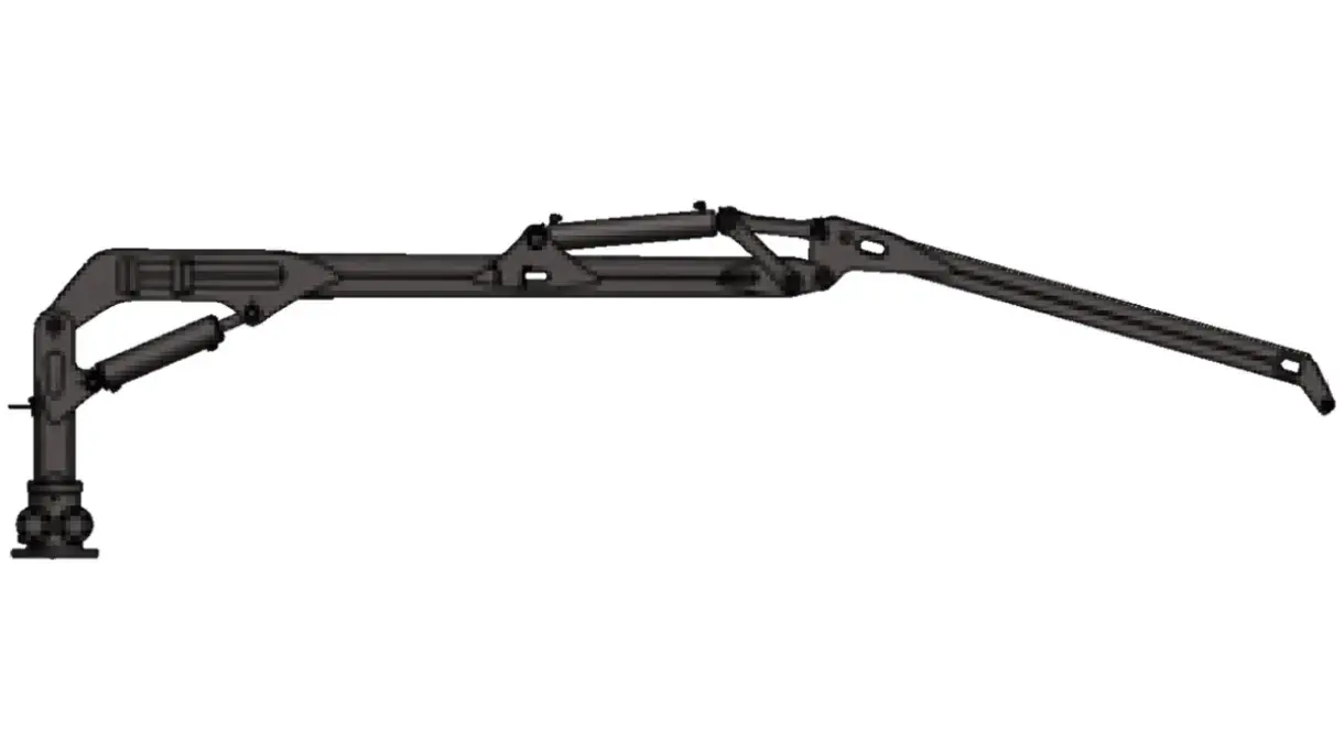 Der Kran hat eine Reichweite von 5,3 m und eine Hubkraft bei maximaler Reichweite von 615 kg (ohne Greifer, Rotator und Verbindung).