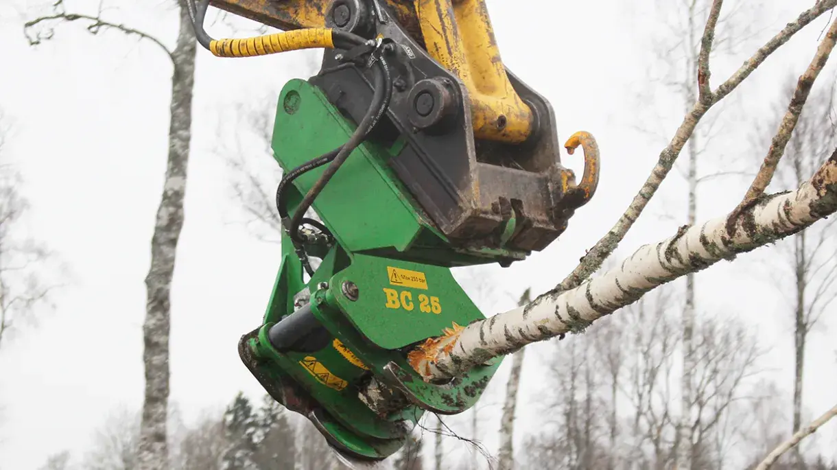 Er kann abhängig von der Holzsorte bis zu 25 cm dicke Stämme fällen. Mit den beiden leistungsstarken Zylindern können Stämme schnell und effizient geschnitten werden. Das austauschbare Messer wurde speziell für den BC 25 entwickelt und besteht aus hochfestem und verschleißfestem Stahl.
