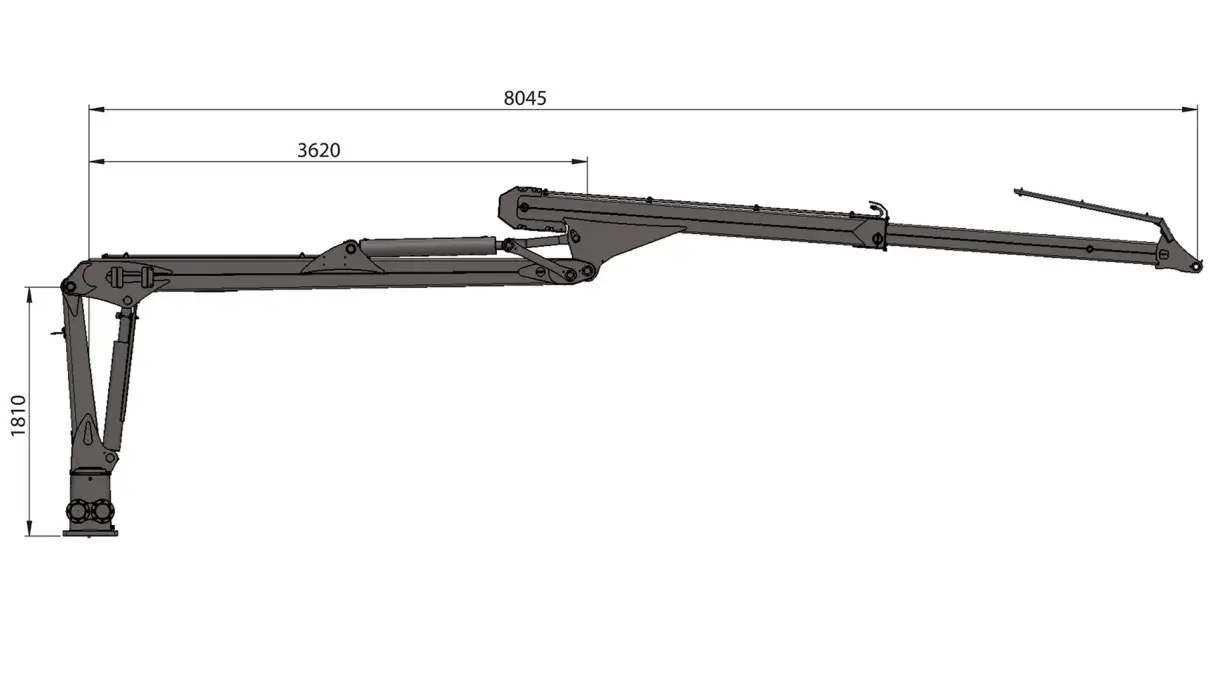The crane has a reach of 8.0m and is equipped with a single extension of 1.97m. C 8,0 X-CEL lifts 790kg at full reach exclusive the weight of the grapple, rotator and link. The crane is equipped with a powerful turn house with a torque of 24kNn and are our strongest crane in the FARMA range.