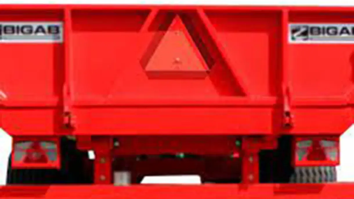 The trailer is equipped with a sign that warns of slow-moving vehicle.
