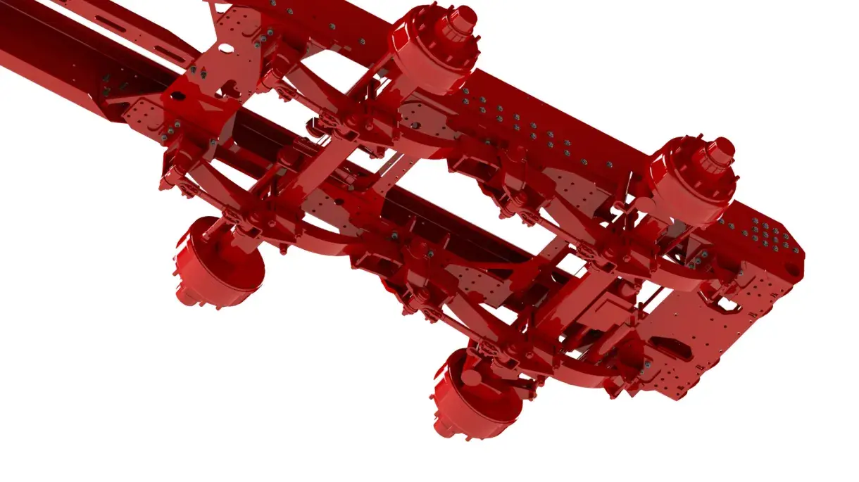 Tandem parabolic bogie is equipped with a suspension package on every axle and a link in between. The suspension is offered on rigid or follow steered axles. The trailer runs amazingly soft and easy.