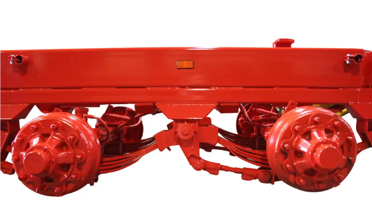 Tandem parabolic bogie is equipped with a suspension package on every axle and a link in between.  The suspension is offered on rigid steered or follow steered axles. The trailer runs amazingly soft and easy.