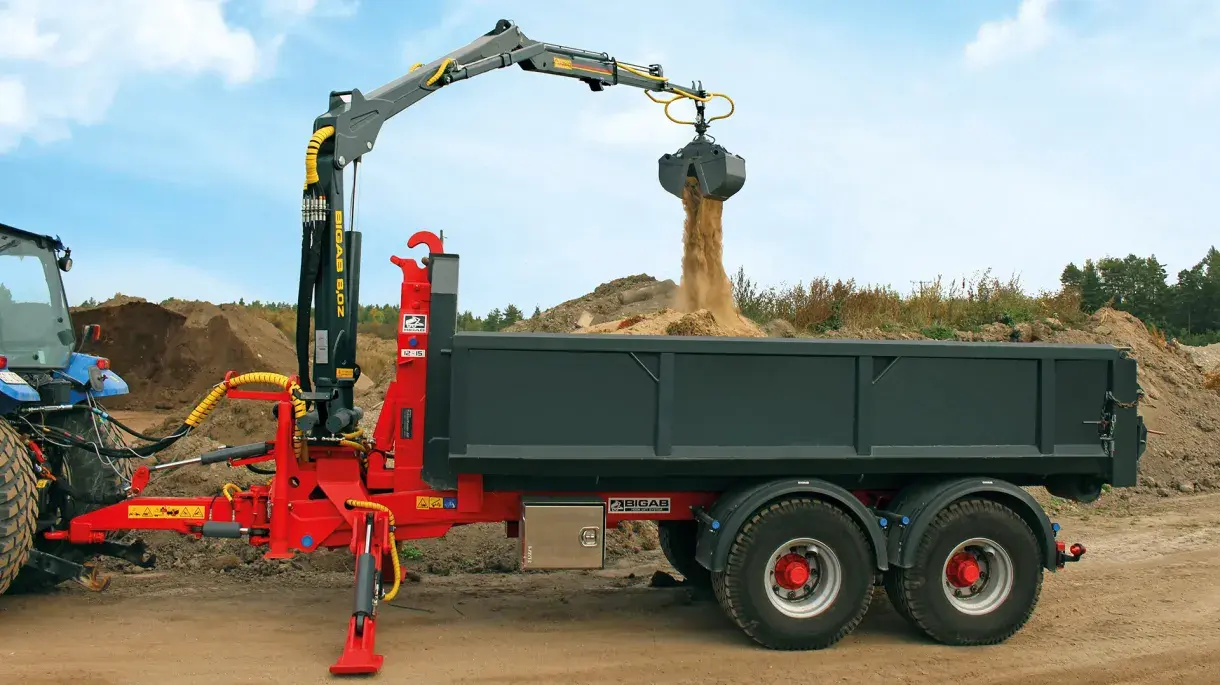 Tous les modèles BIGAB peuvent être équipés d’une grue pour une plus grande polyvalence. La taille de la grue dépend de celle de la remorque. Pour les modèles 7-10 et 8-12, la remorque peut être équipée d’une grue FARMA.