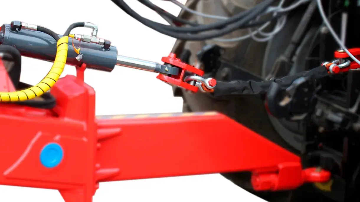 Pour réduire les contraintes au niveau du tracteur et de la boucle de remorquage, le verrou hydraulique de châssis permet de transférer le poids vers le tracteur au moment où la charge quitte le sol. Il s'agit d'une sorte de vérin de transfert de poids qui fonctionne en conjonction avec le blocage du bogie (sans interaction avec les bogies suspendus) et augmente la stabilité de la charge et la marge de sécurité. Avec le verrou de châssis, c'est tout le tracteur qui sert de contrepoids lors de l'accrochage.